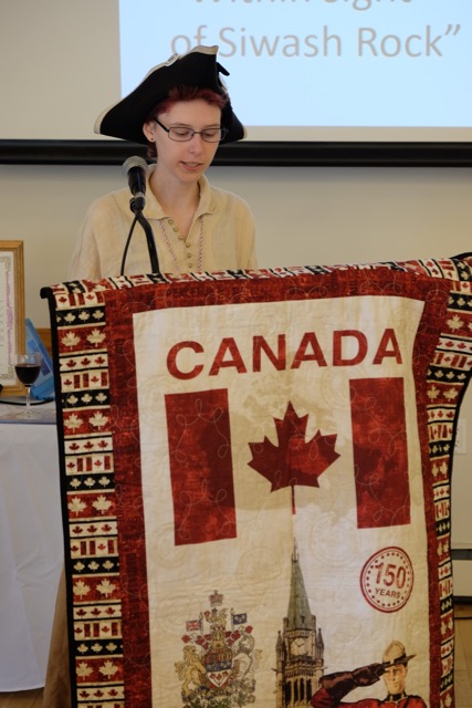 All of the presentations were well researched, informative, and interesting. Students presented their critical thinking project boards and spoke well of their research. Each student also must complete a written as well as a creative component. The students, familiar only with giving these presentations on a "one-on-one" basis with their respective adjudicators during the Heritage Fair did a great job of speaking in front of such a large group. Past President and Vancouver Branch Co-ordinator for the BC Heritage Fairs, Carl Stymiest UE chaired the programme. Carl along with Vancouver Branch President Gwen Dumfries UE and Christine Manzer UE, presented each of them with a CANADA book, a UEL ribbon and George III Cypher pin, a Certificate of Excellence and a 1914-2014 UELAC bookmark.